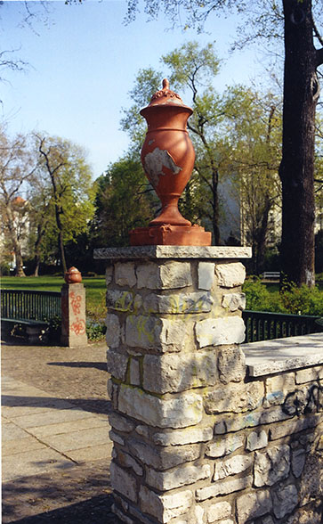 Wie bei den vier übrigen Schuckelementen von Matzner an diesem Platz handelte es sich auch hier bei der Aufstellung 1987 zunächst um Terrakottavasen. Aufgrund der durch hohen Vandalismus entstandenen Schäden wurden diese Vasen etwa 1992 durch terrakottafarben gefasste Kopien ersetzt, die allerdings auch unter Mitarbeit von Matzner selbst entstanden sind (Susanne Kähler nach Auskunft von Herrn Tomas Cordes, Umweltamt, Untere Denkmalschutzbehörde).