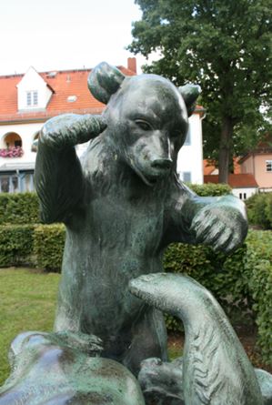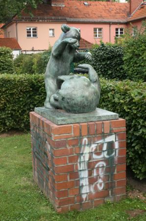Auf einem rechteckigen Sockel aus roten Klinkern steht auf rechteckiger Plinthe die Gruppe zweier mit einander spielender Bärenkinder (Bärenjungen). Eines der Tiere liegt auf dem Rücken, das andere steht auf den Hinterbeinen (Jörg Kuhn).